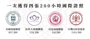 課程架構同時符合美國瑜珈聯盟(RYT)、印度瑜珈聯盟(YAI)、加拿大瑜珈聯盟(CYA)之高規格標準,並獲台灣印樂國際運動培訓發展協會核可