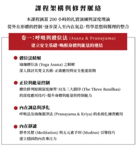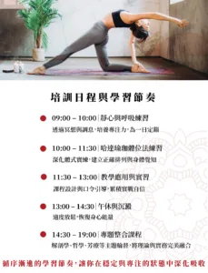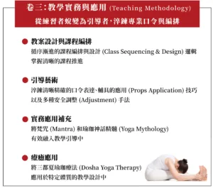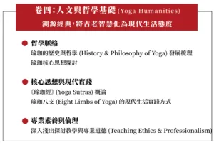 課程從體位法練習、呼吸與冥想,一路深入至解剖學、哲學人文,並扎實演練教學實務